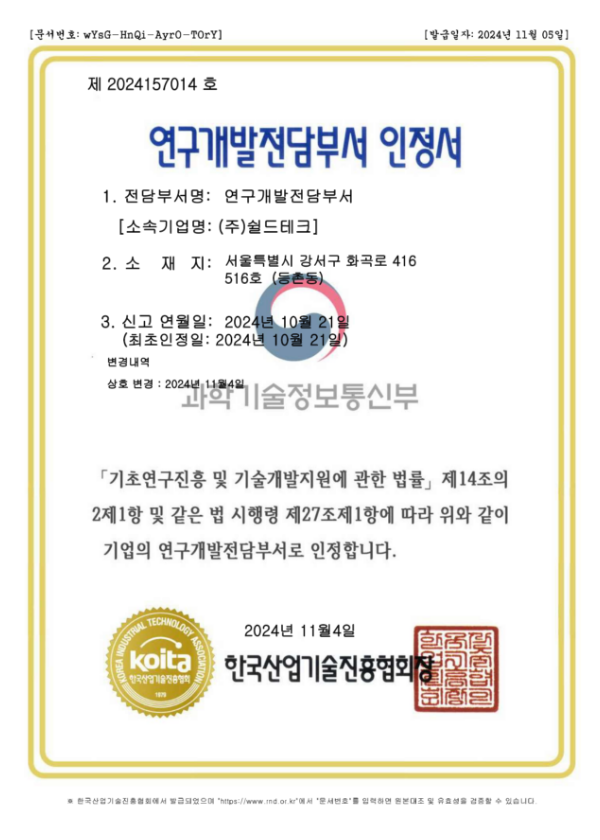 연구개발전담부서 인정서