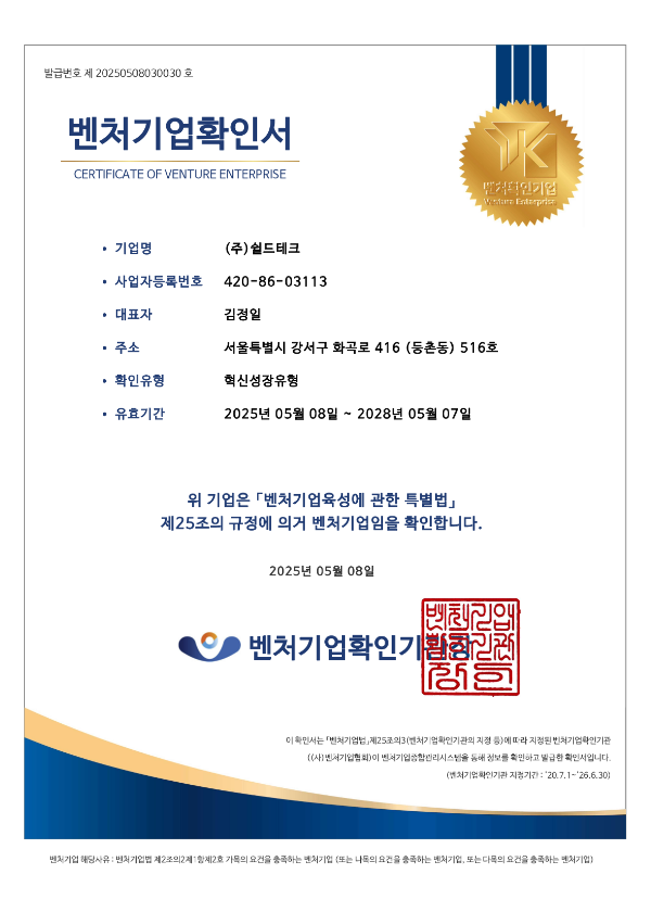 기술적 우위와 실질적 성능을 모두 입증한 쉴드테크만의 신뢰할 수 있는 기술과 특허입니다.